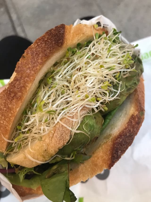 Perfectly nice and plain sandwich. Fresh bread makes the difference, and the sandwich comes with three pieces, layered with avocado & sprouts.