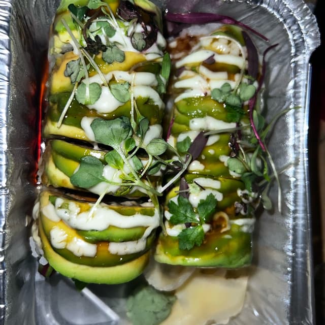 This is the best vegan sushi roll I have ever had. I know it has sweet potato inside and thinly sliced avocado outside with some kind of sauce but I will definitely be going back for more!!