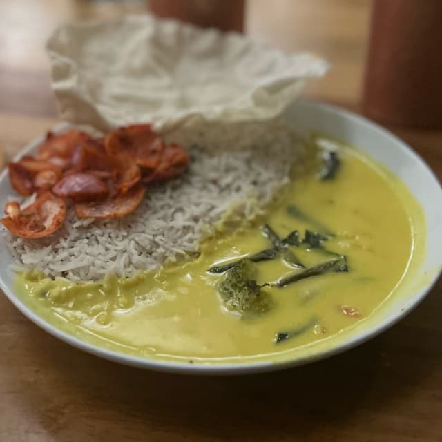 Veggies including broccoli, carrot and beans in raw mango coconut curry served with coconut rice, laccha onion and papad.