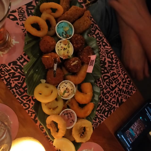 the Kalamariz (calamari) was amazing, with exactly the right texture and flavour. flamboyant shrimpz (shrimp) were also good and flavoured well. the two varieties of betterballs were very hot and fresh. the no wings were fine with nicely spiced batter, although I’ve had similar things from supermarkets. really tasty and unique sauces too. 3 of each item (6 betterballs total) for €18.95