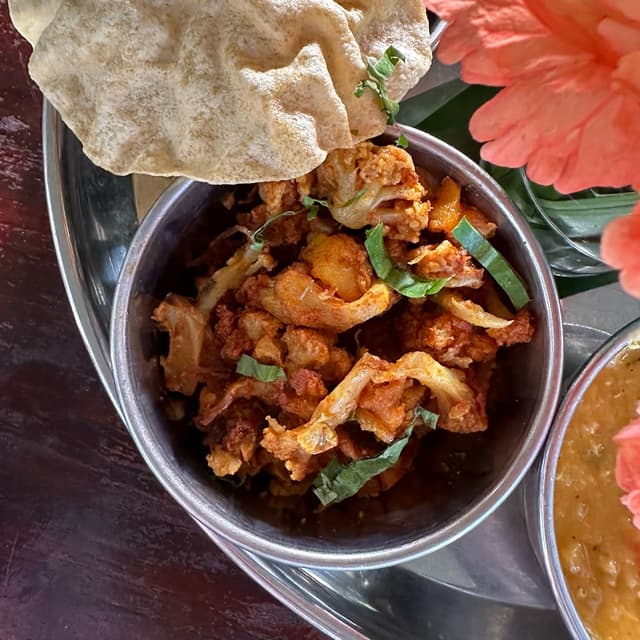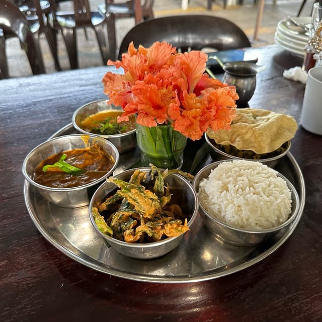 The name is a lil different to when I ordered it, but when I read the other review I realised it’s just the same 🌝 A simple, genuinely delicious, and soulful set of #thali 🌚 One apt for a warrior 🌱 You’ll get that if you were to visit 😉 This place is whack! This restaurant serves as an entry to what is one of the whackiest places on this island - Bollywood Farm 🏝️ Equipped with even a nudity allowed zone! Of course my hippie friends would invite me here.. 😂 We got this as a set for 4 to share in the mid-afternoon after a session of strolling and suntanning in the small but calming gardens ⛲️ You’ll have to #asktoveganize the vegetarian set or so I believe you do, in spite of their #raita being #dairyfree as is already 🙌 It’s #coconut based though, so hold your breath if you’re one of those weirdos who dislike it 😴 I can’t make head or tail of what the individual platters are, or rather, I can’t be bother 🫢 ..but off the menu, they are vegetable #curry, #aloogobi, #dhal, moringa, the aforementioned coconut raita & a serving of #papadam 🤤 Oh and you can actually opt between rice or #prata! That said, I’m not sure if the latter is vegan 🥑 This was super delicious by the way! I adore the little plates of #fritters they had 😋 I can’t say I felt quite warrior like after the meal, but I’d fight for a meal this good any time 😙