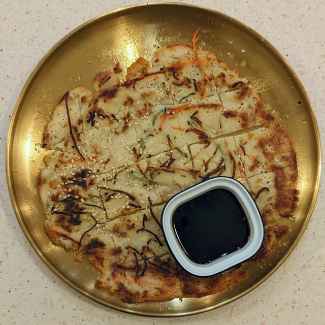 Pleasantly chewy vegetable pancakes with a crisp exterior, dotted with charred bits of vegetables such as shredded carrot and zucchini. 🥞🥕🥒 Came with soy-vinegar sauce too. Swipe right ➡️ for a close-up! 📸 Tasted great like the ones I recently had in Korea! Admittedly rather greasy though, the gold plate was extra shiny hahaha. #sweetdreamsaremadeofgrease 😬 For those who prefer spicy food, there's also a Kimchi Jeon available in the menu~ (Allium-free, $11.50) #sgvegan #koreanfood #alliumfree #wholefoodplantbased #wfpb