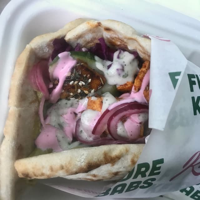 This place changed their name to RoseHip Vegan Kebabs quite recently. Menu now includes various types of #kebabs in lavash or pita bread, but overall less food options than before. This one comes in #pitabread, contains #marinatedtofu with zaatar spices, green #hummus, cucumber, marinated red cabbage and onion, pink garlic mayo sauce and tahini yogurt sauce. It’s as #flavorful and tasty as it sounds! Costs 7,50€, but it’s big, #nutritious and #filling so I guess worth it. #compostable packaging made from sugarcane.