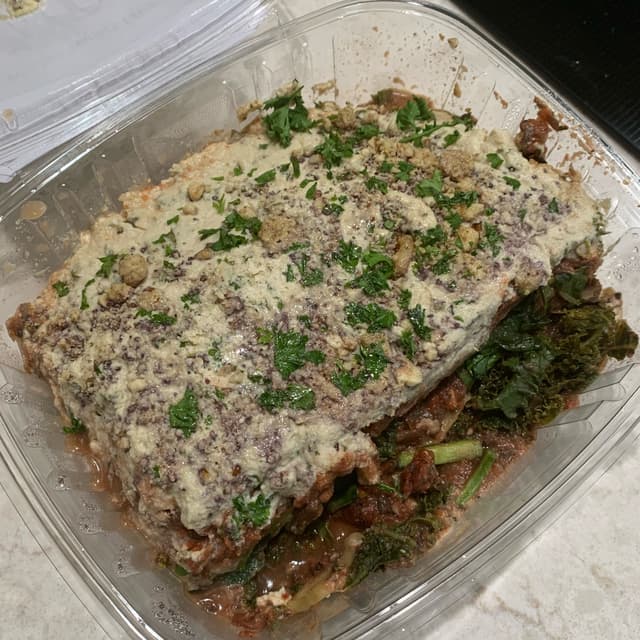 from the archives . . . my sister bought this #veganlasagne when i was visiting earlier this year. I am not the person to review this because I do not like zucchini. I picked it out and gave it to her along with the kale. otherwise, the flavor was very good. she loved her half of it!! as with most prepared/take-out food, there has to be a container. they have creative food. she got something else from them but i didn't get a foto. their menu changes weekly and it looks like they have a meal service with reusable containers.