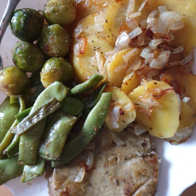 Patatas con cebolla a la sarten , judías verdes, coles de Bruselas, y hamburguesa de quinoa.