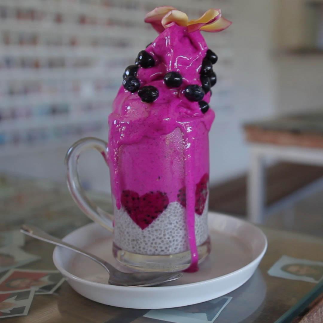 Very sweet! It's sort of a smoothie bowl mixed with chia pudding in a glass. It's also a massive serving. Chia pudding topped with a frozen dragon fruit, banana and blueberry smoothie. This may be vegan, but it's not confirmed on the menu. I'm pretty sure the chia is with coconut milk. #chiapudding