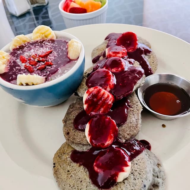Great texture and taste. Fluffy. Good amount of toppings, plus you get two sides, for $12. I went for fruit salad and atole (blue corn porridge)