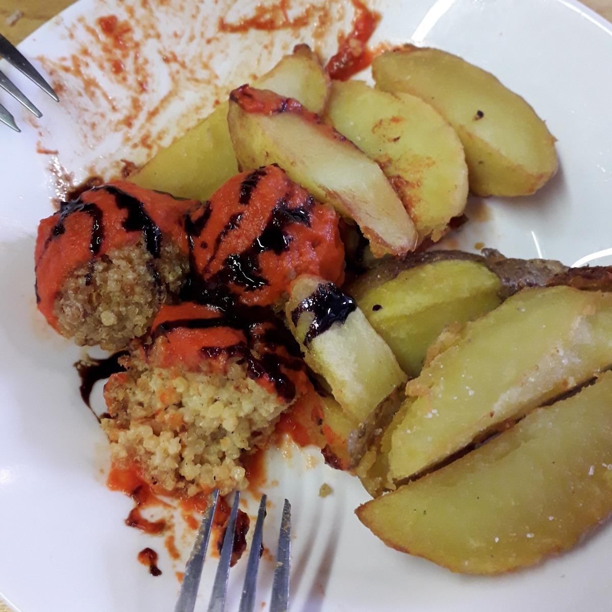 Estas albóndigas están buenísimas, crujientes por fuera. Les acompaña una salsa de pimientos rojos estupenda.