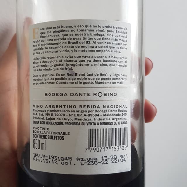 Ame este vino red blend de Bodega Dante Robino , envase retornable ecologico , un red muy light y frutal . Me encanto .Precio 290 p