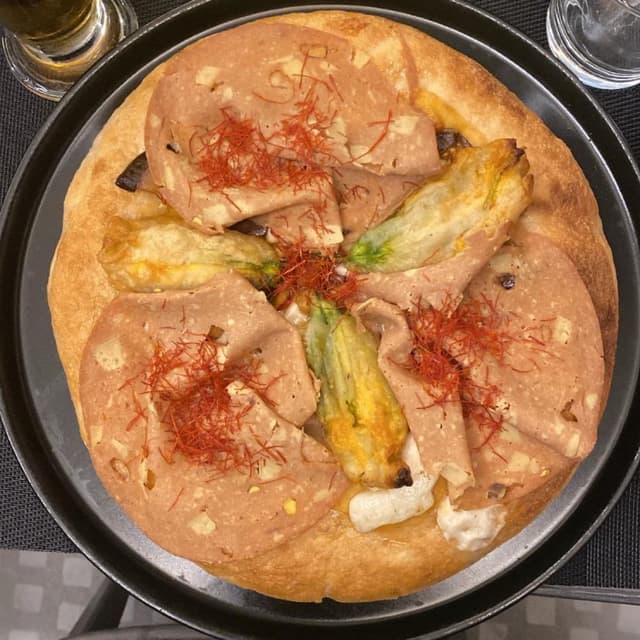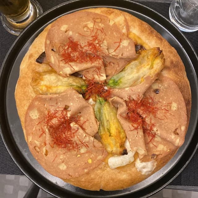 La mortadella vegana è saporita ma leggera e i fiori di zucca ripieni di ricotta veg sono da volare via