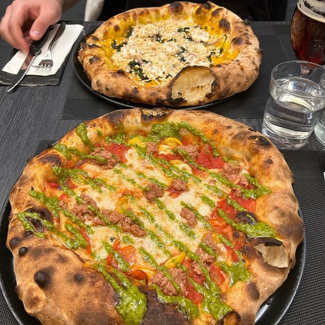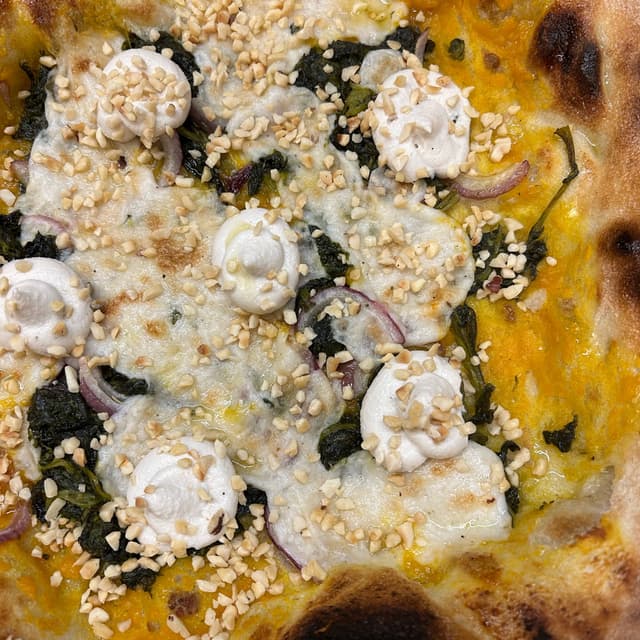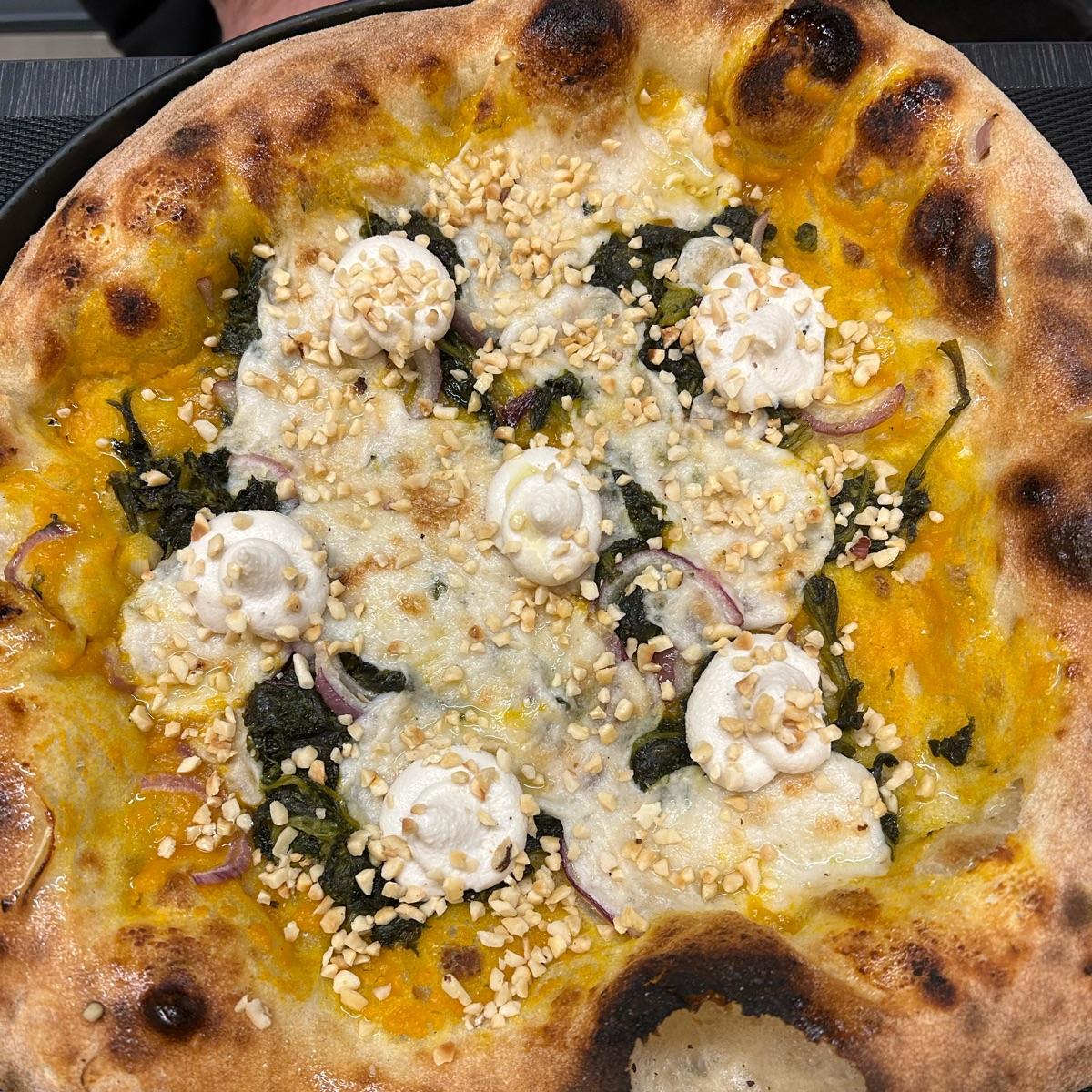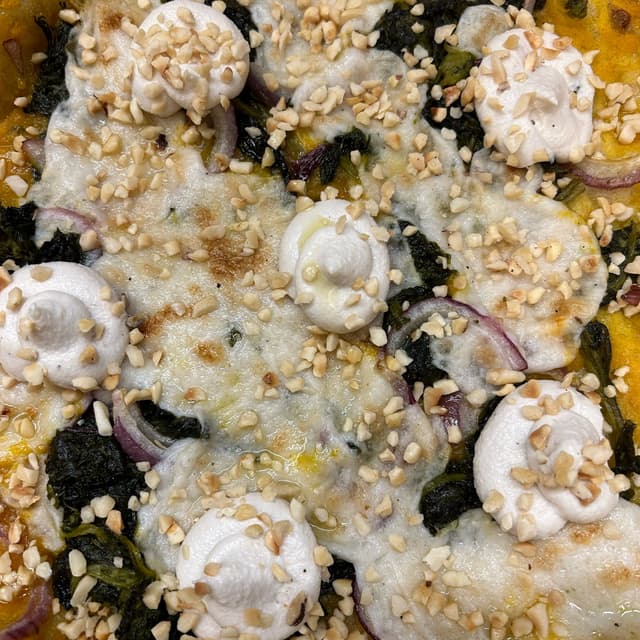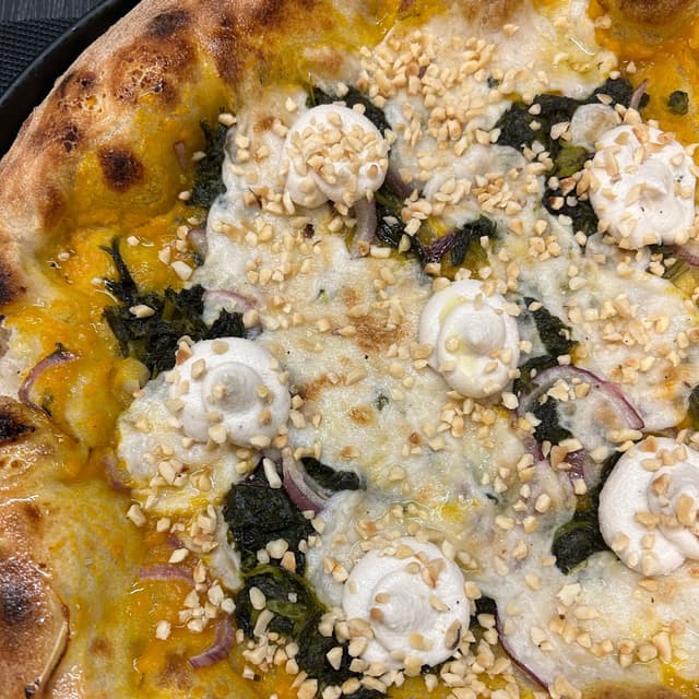 Buonissima pizza vegana con crema di zucca mantovana, mezzarella, friarielli alla napoletana, cipolle rosse di Tropea, cremoso all’anacardo e nocciole tritate