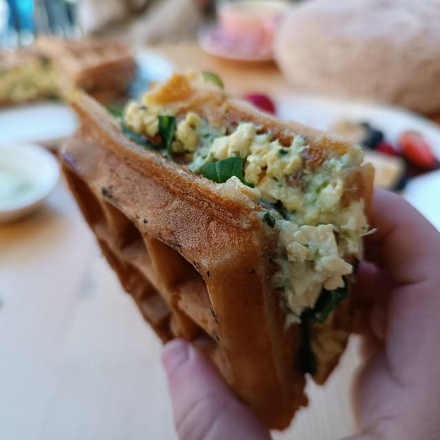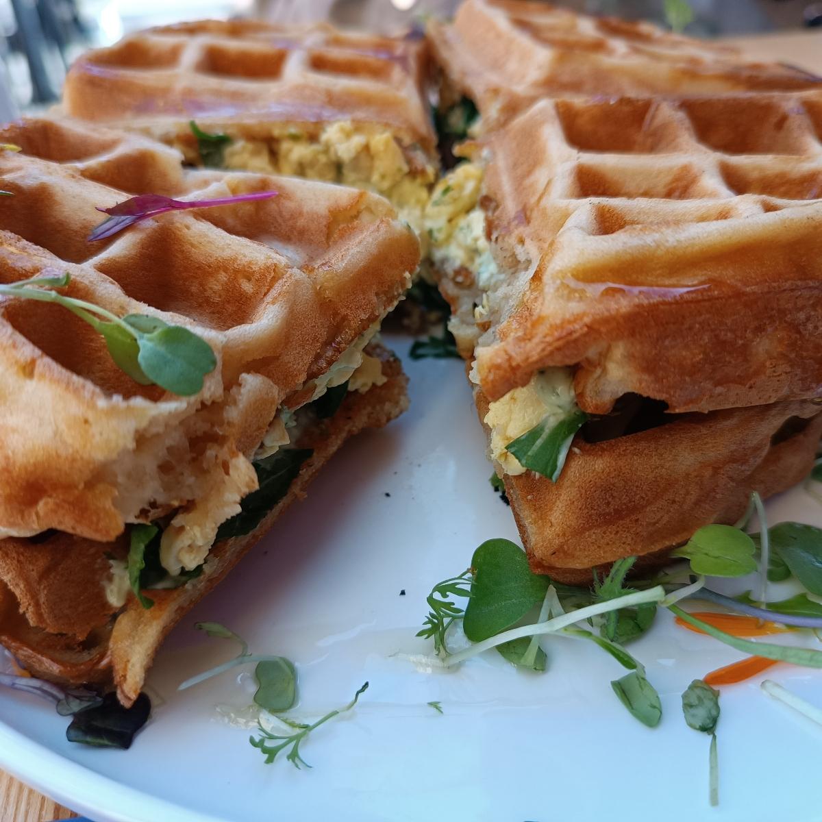 Gofres salados rellenos de revuelto. Plato muy completo y delicioso. Ideal para compartir