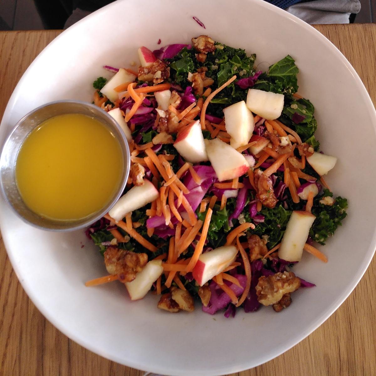 Marinated kale with quinoa, red cabbage, diced apples, shredded carrots, agave roasted walnuts with mango vinaigrette.