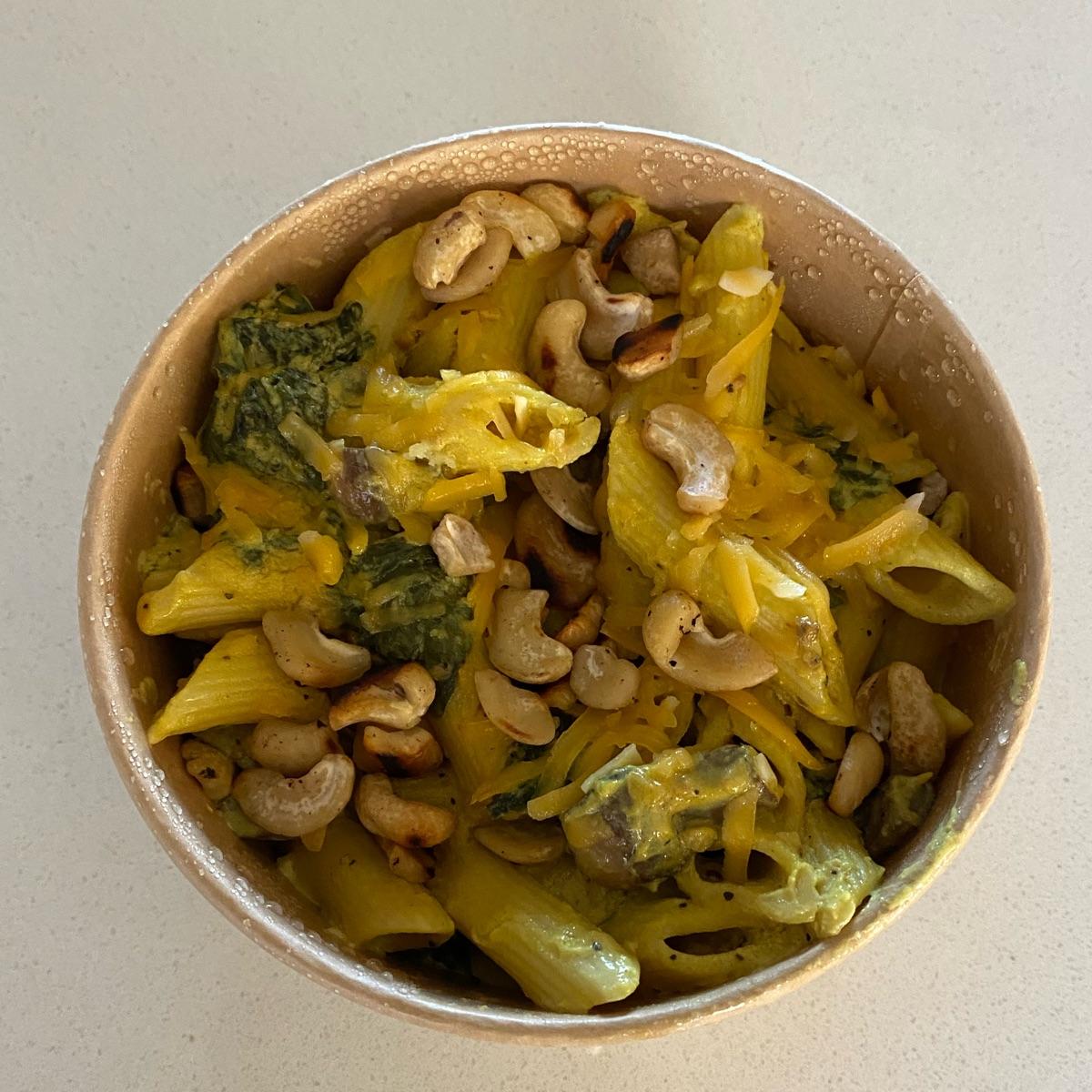 ‘Exotic mushrooms, spinach, creamy cashew sauce, penne’.