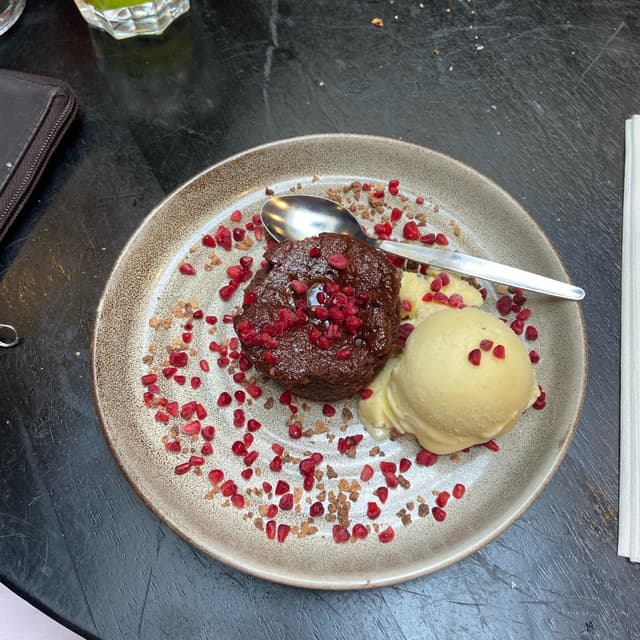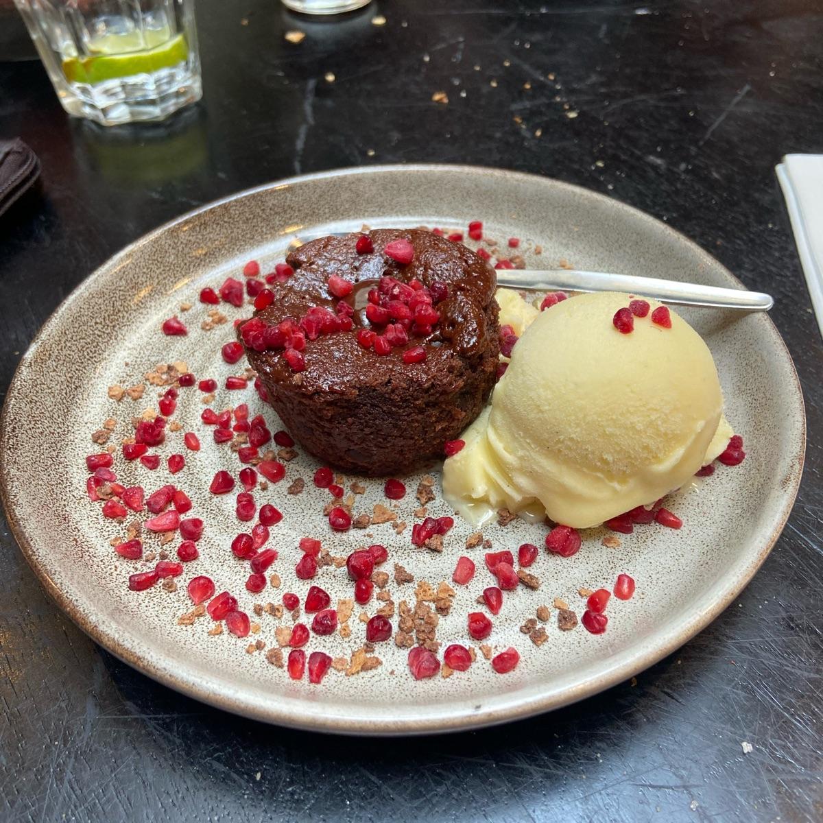 This is a Moelleux, accompanied with vanilla ice-cream and dried raspberry (sprinkles?)