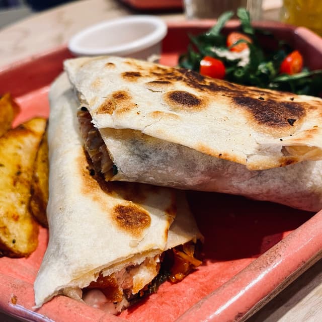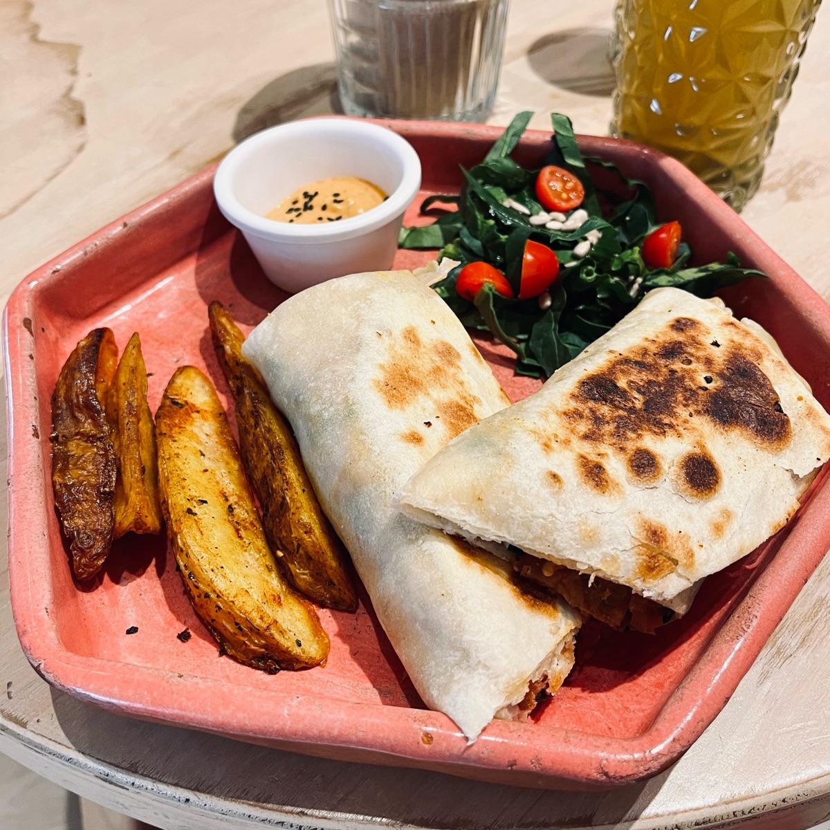 Tenía mucho rato de no venir a este lugar y ahora que regresé me gustó mucho. Este wrap va relleno de crispy tofu, kimchi, jitomate y cebolla. Lo acompañan con una pequeña ensalada de espinacas, papas a la francesa y un aderezo de chipotle que pica mucho pero sabe muy bien. La porción es de buen tamaño y tienen promociones en wraps y bowls entre semana. No dudes en pasar por ahí si te encuentras por el rumbo. Muy recomendable 👌 #govegan #veganrestaurant #sincarneporfavor #tofu #friendsnotfood