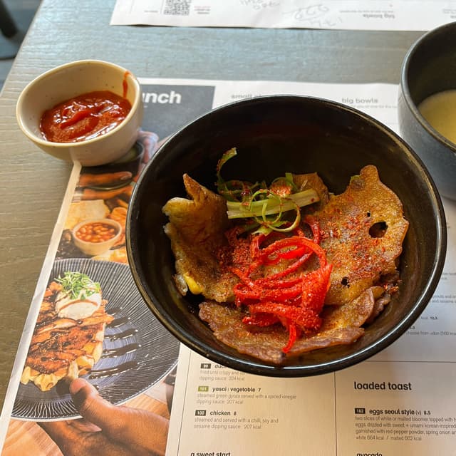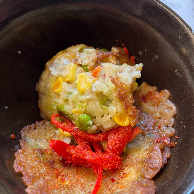 🫛🌽 This is very original with #edamame and #corn in #fritters. It’s like a savory kind of crepe or pancake. There were maybe three little pancakes with some #springonion #chilli 🌶️and red pepper powder. It was inventive and nice but I wouldn’t order again. #veganlondon #londoneats