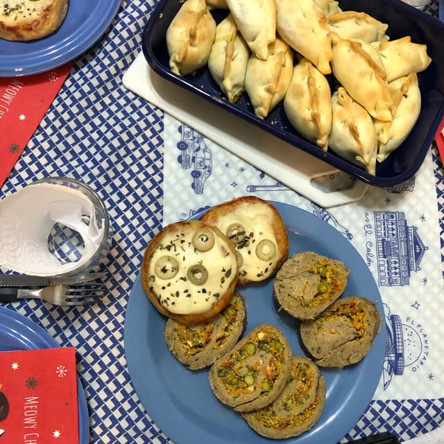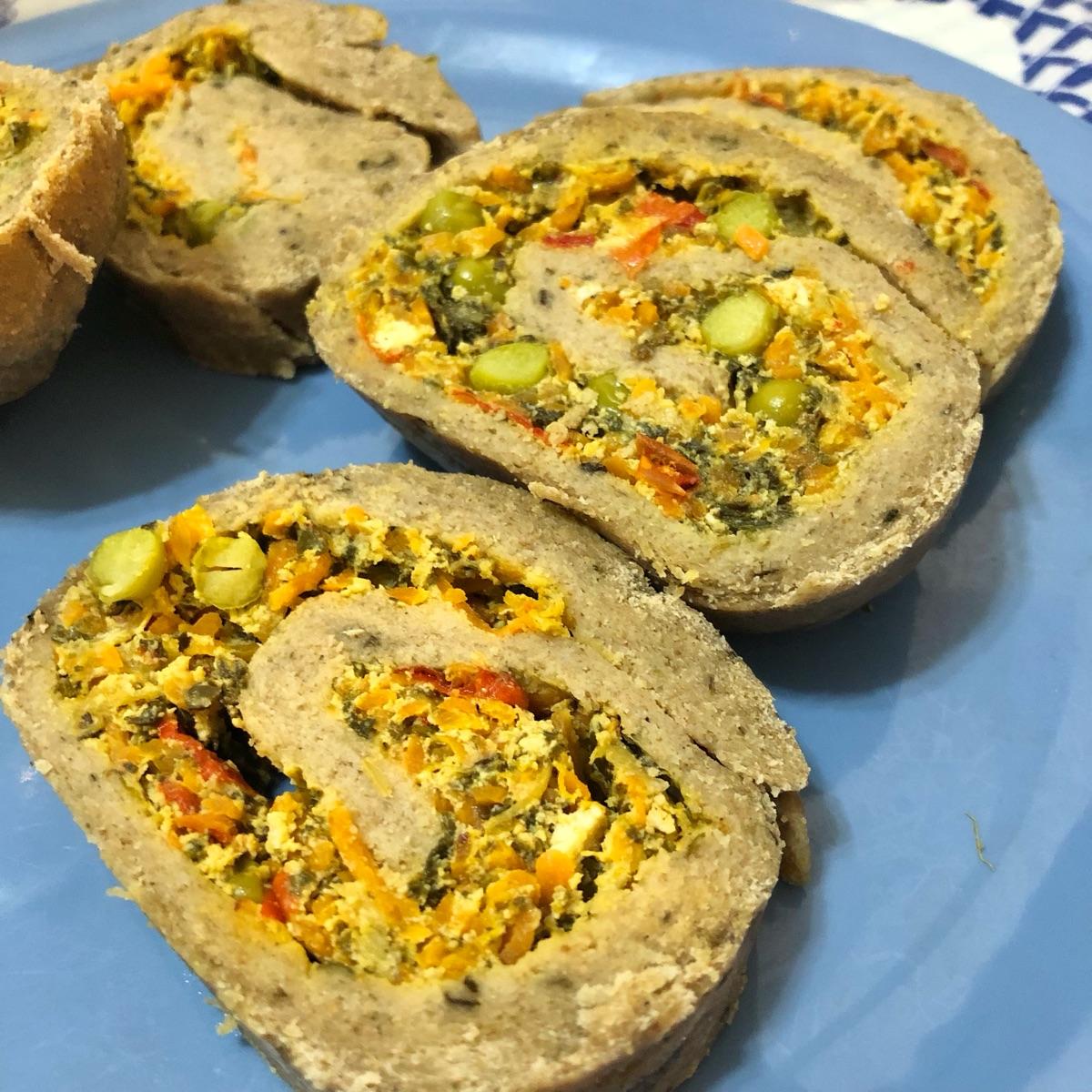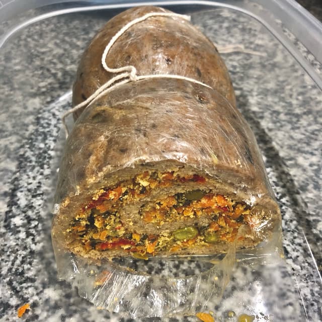 El matambre es a base de seitan (creo) relleno de tofu y vegetales como arvejas, zanahoria, morron. Te aclaraban que rinde entre 10/12 rodajas y sí, salieron 12/13 porciones.