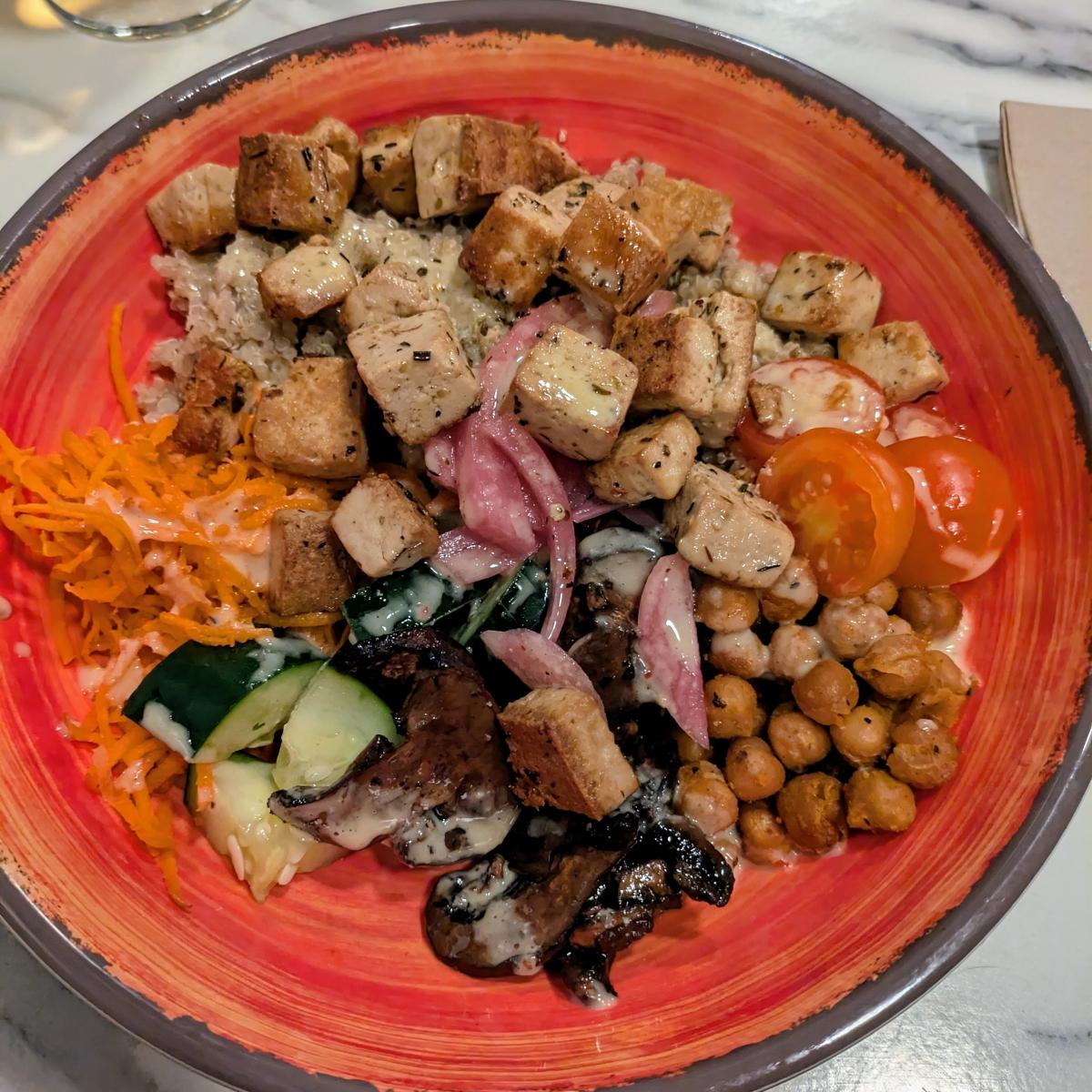 This bowl comes with seasoned quinoa, roasted chickpeas, marinated cremini mushrooms, cucumber, cherry tomatoes, shredded carrots, and pickled onions. Topped with a tasty house citrus vinaigrette. Highly recommend!