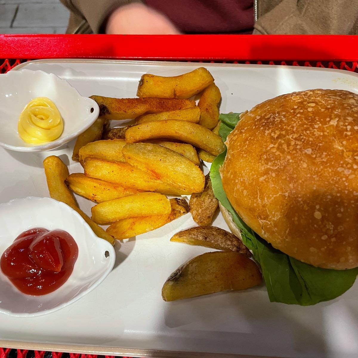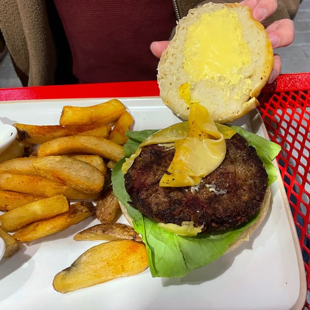 Good burger with fries. Not sure exactly what the patty is made of.