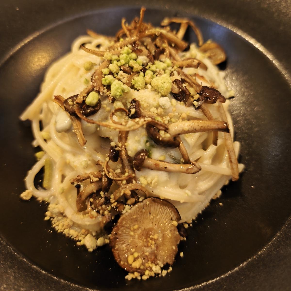 Uno spaghetto con una crema di anacardi molto delicata e i funghi molto buoni