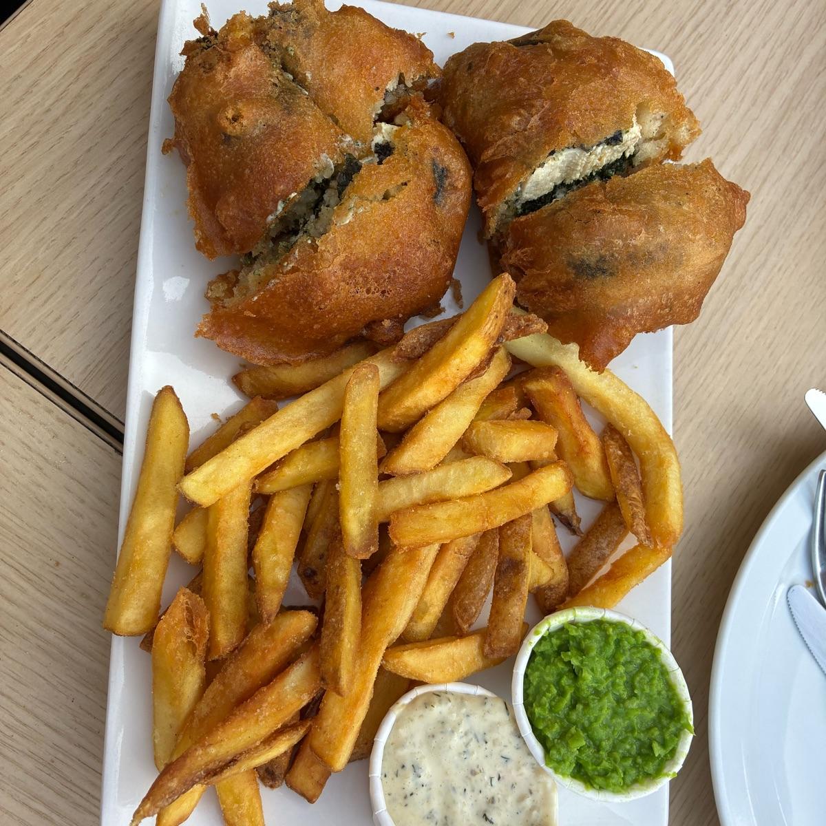 Golden battered tofu with a sheet of nouri, served with chips, tartar sauce and mushy peas. It was pretty nice, not very healthy but we quite enjoyed it.