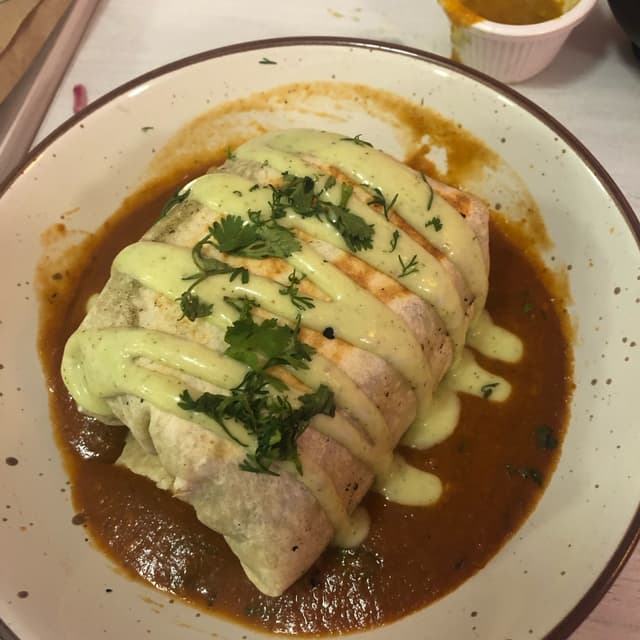 Burrito mojado vegan con bebida, súper rico y de buen tamaño, el queso no me mató pero también estaba rico🙊.