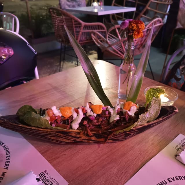 Se pasa de rico todo en este restaurante. La canoa es un plátano maduri que trae "carne" desmechada, guacamole, pico de gallo y crema vegana 🤤🤤🤤