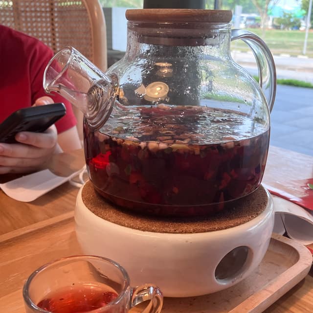 Refreshingly tangy tea brewed with assorted fruit peels and cherry tomatoes etc. Served with rock sugar sticks which we could dip into the cups to sweeten the tea. However the sugar melted quite fast and we ended up with cups of super sweet tea haha. Would recommend dipping the sugar into the whole pot instead! Cute concept and good that the sweetness level is customisable based on personal preference. ($12.90)