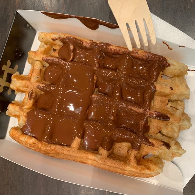 Vegan waffle with chocolate. So delicious 😋 we decided to divide it into 2, so that it was a bit lighter 😅 a bit expensive but in line with Grand Place’s prices