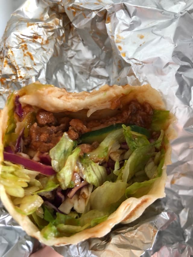 So happy that stuff’d sells the impossible:) They kebab comes with a variety of veggies and a generous helping of the ‘impossible’ meat. The sauce that comes with the meat is very slightly spicy. Also note that not all the sauces are not vegan.