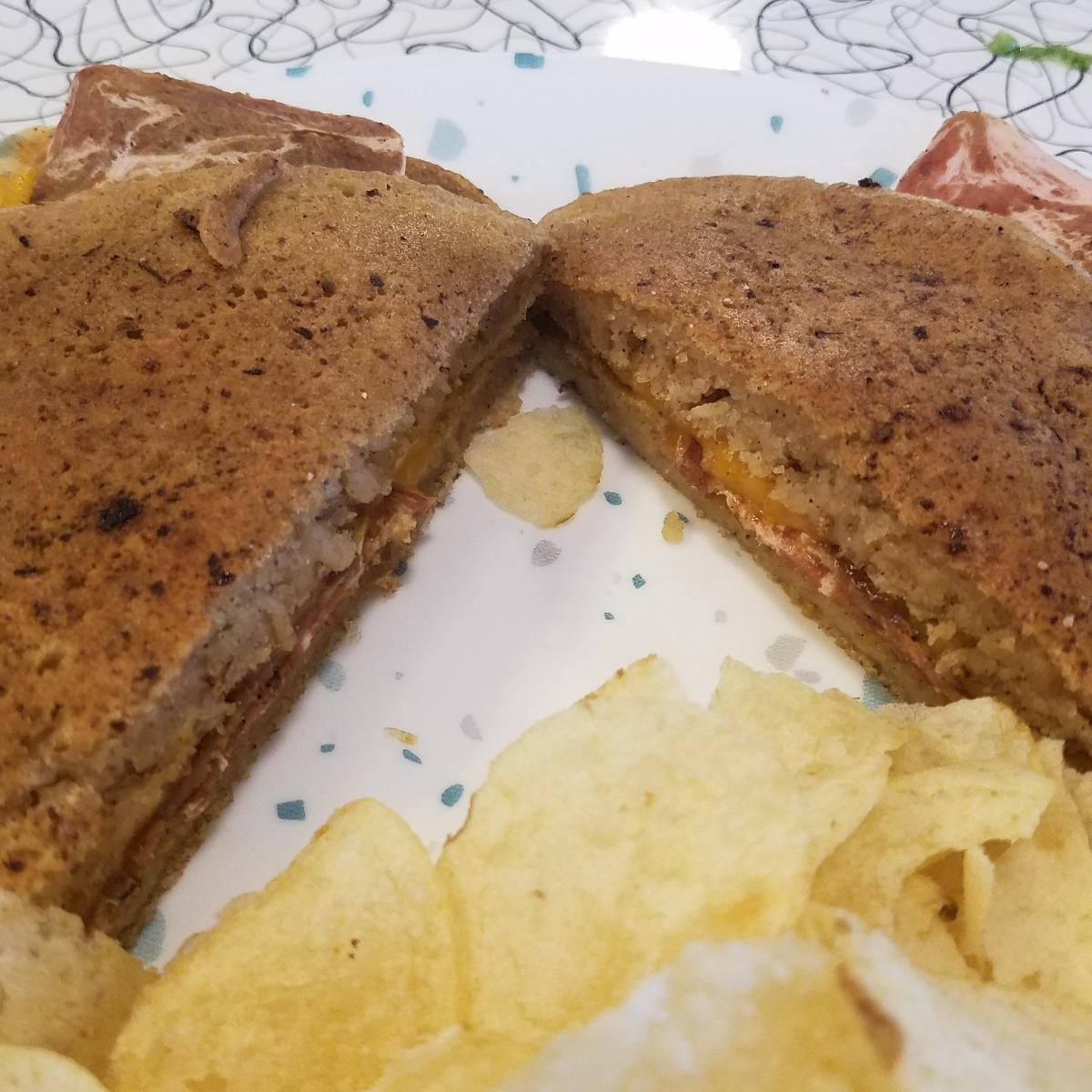 This was incredible! So savory, cheesy and sweet! Sweet pancakes with melted cheese and vegan bacon!