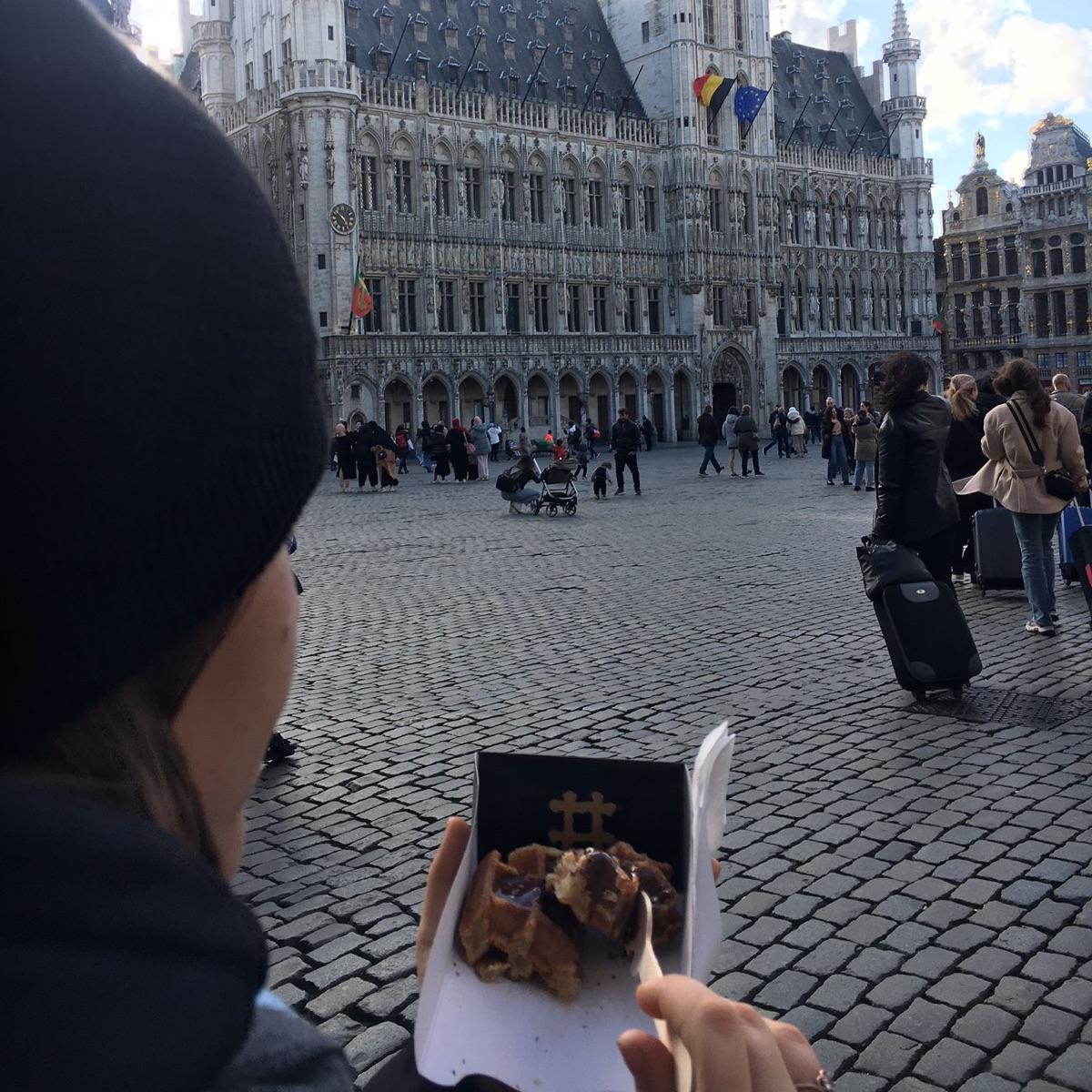 Vegan waffle with chocolate. So delicious 😋 we decided to divide it into 2, so that it was a bit lighter 😅 a bit expensive but in line with Grand Place’s prices