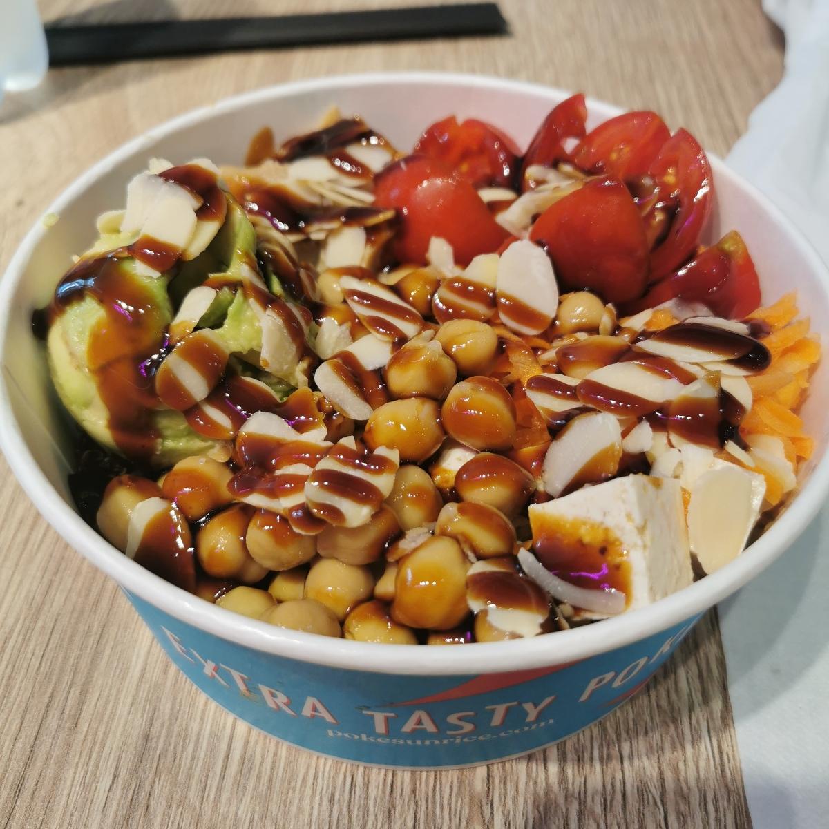 Ho preso la poke già composta da quinoa, tofu, almost chicken, avocado, ceci, pomodorini, carote, mandorle a scaglie e salsa teryaki. Nel complesso mi é piaciuto anche se l'almost chicken aveva un saporaccio di plastica e troppo salato