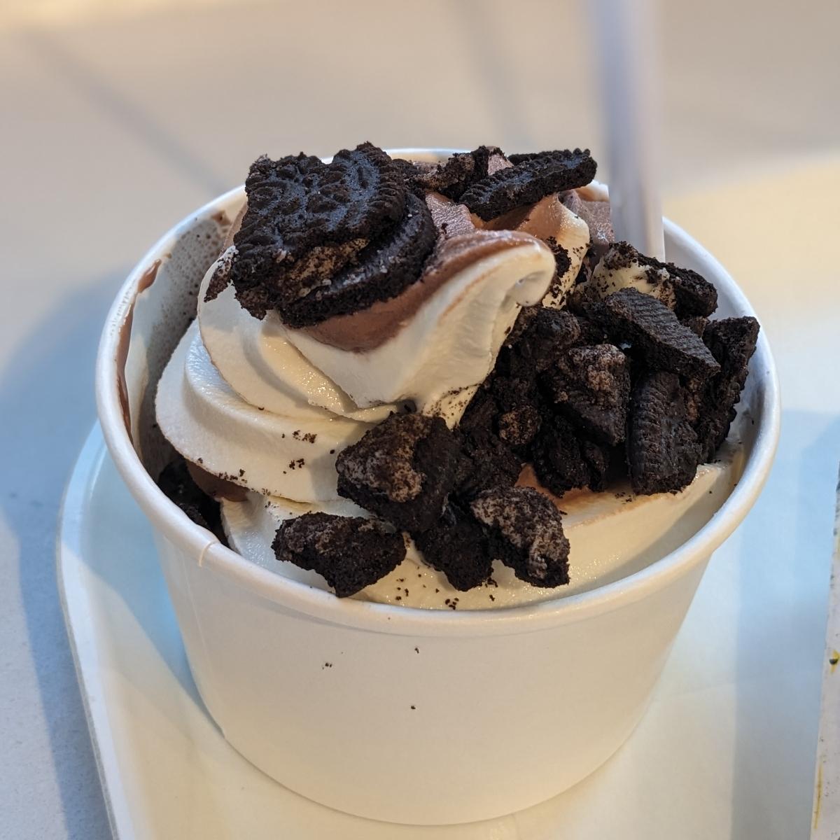 I usually opt for a shake, but decided on soft serve this time thinking it would be a smaller serving. I think it ended up being about the same size! It's definitely a much cheaper option at $3.95 instead of $6.95. You can get it in a bowl or cone. I wasn't feeling the mess today, so I just settled with a bowl. You can also choose between vanilla, chocolate, or twist. I enjoyed the twist. There are also toppings for $0.85 each. Oreos are never a bad choice!