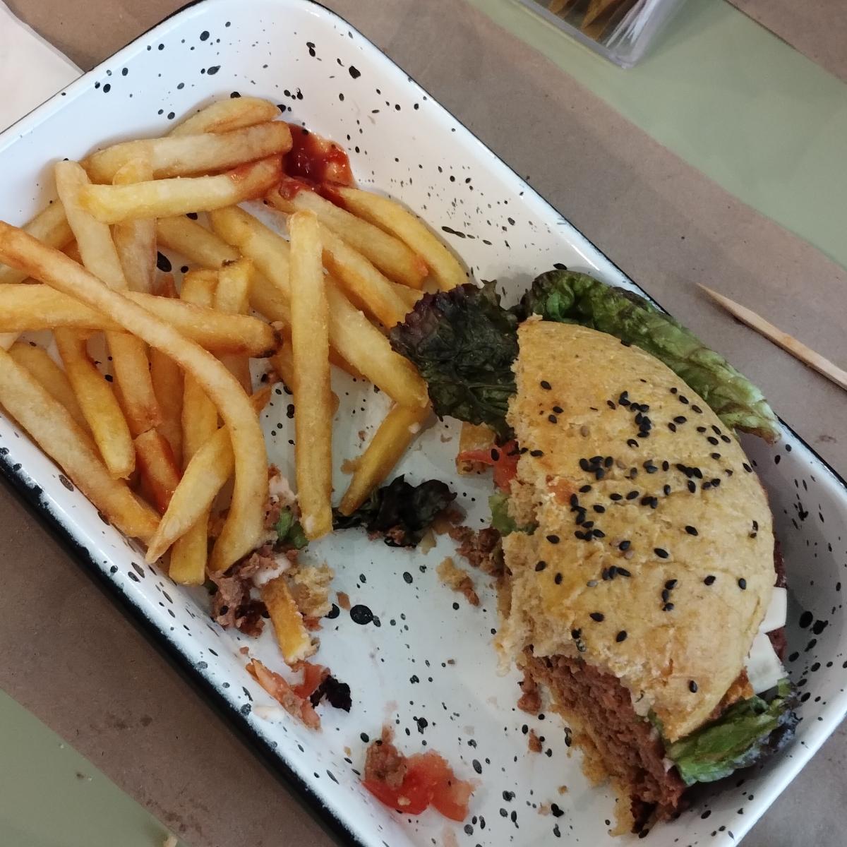 Suuuuper abundante ! Doble burger, queso de felices las vacas. Gigante!! Muchas papas. Hermoso el platito. Muy sabroso. Pense no iba a poder comer todo !! El lugar siempre muy amigable, muchas opciones vegan 🌿🌸🪻