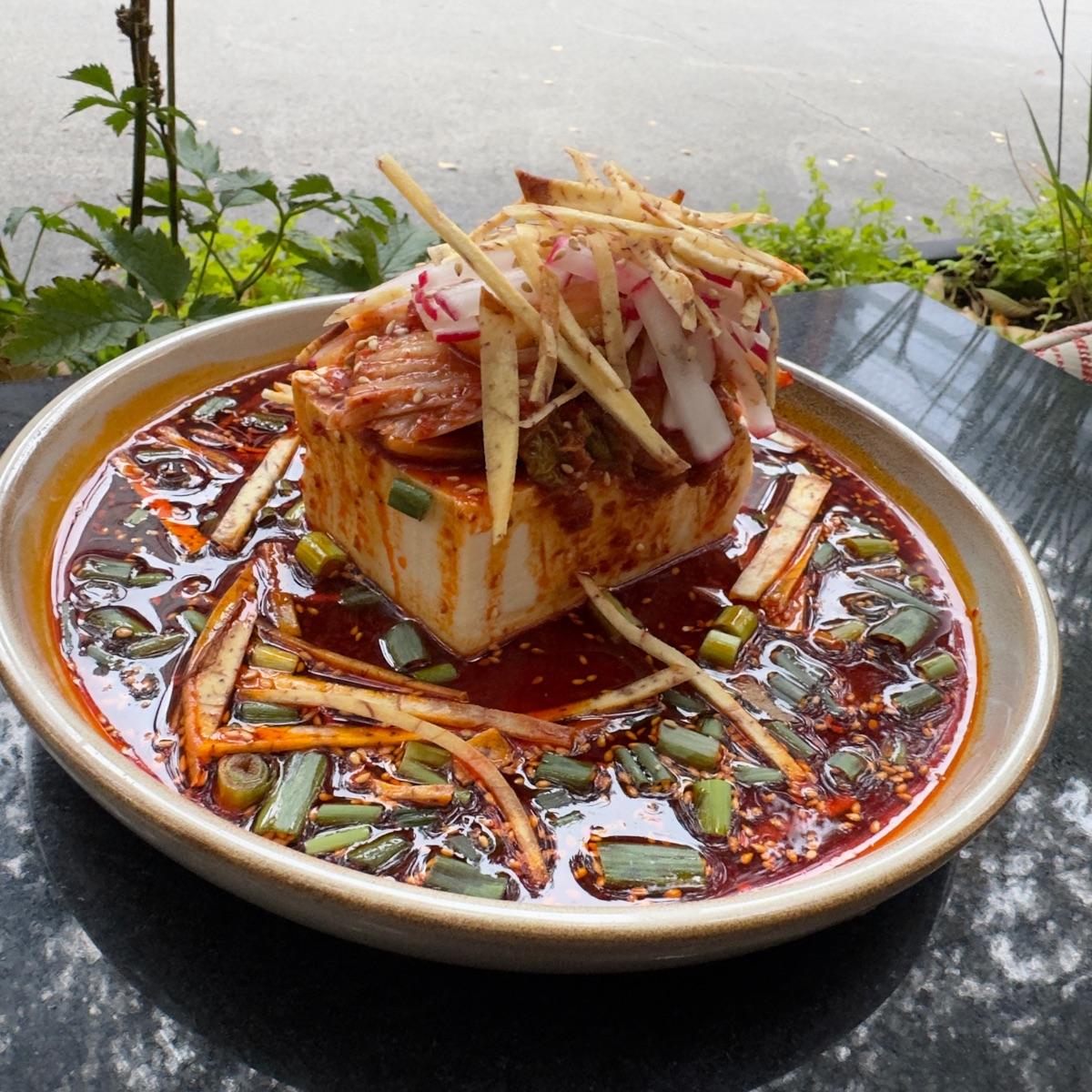 Block of tofu scored into strips and topped with #kimchi #radish #scallions, #sesame #szechuan soy sauce and taro sticks!