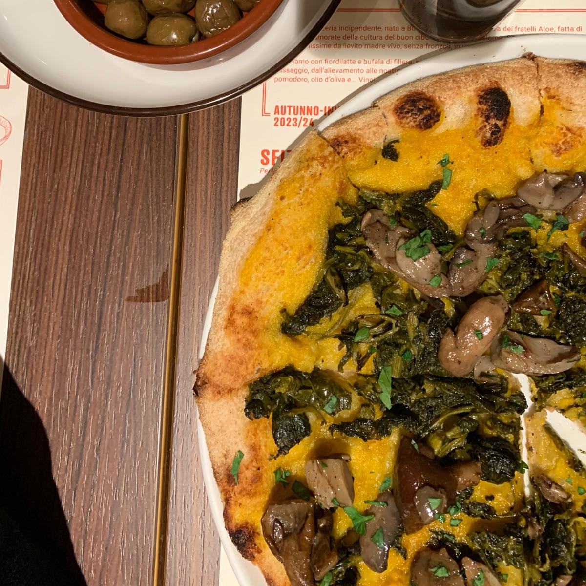 Ho fatto togliere i formaggi dalla pizza zucca e funghi e aggiungere i friarielli (assurdo che mi abbiano fatto pagare +1,5€). La pizza comunque è davvero molto buona.