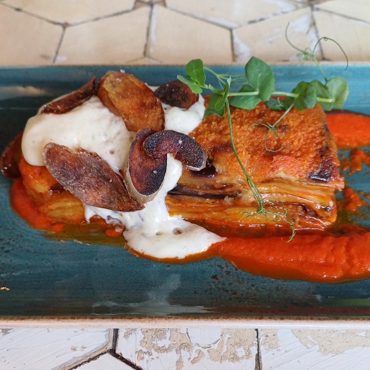 Questo millefoglie di melanzane é fatto davvero da tanti strati sottilissimi di melanzane, credo fritte, buonissime e per niente unte, impanate con pangrattato e farina di riso.