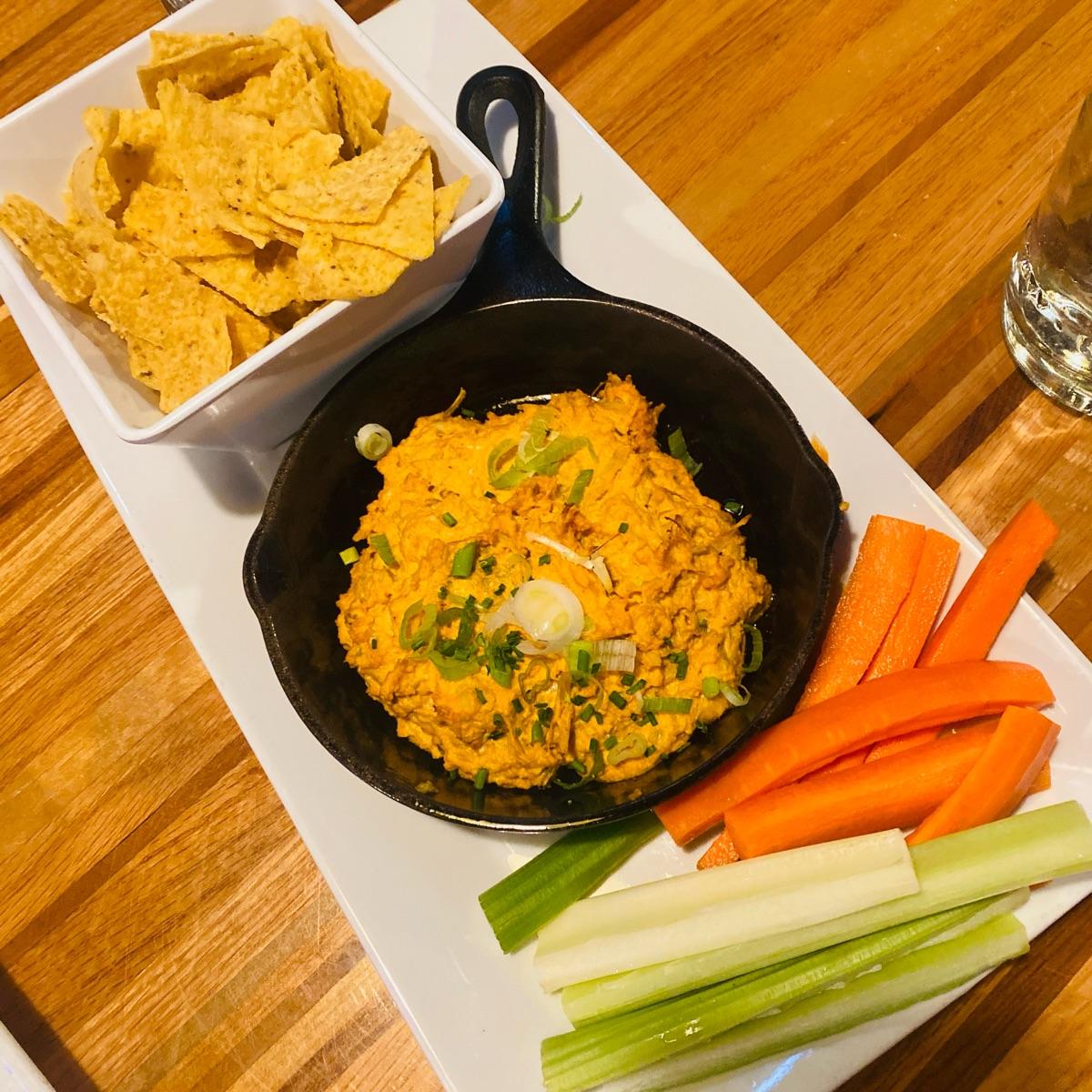 This was so good I went home and tried to recreate it! Of course the restaurant version was better lol. It was creamy, the artichokes were kind of chunky, and it had a great buffalo flavor. Big portion too with lots of dipping options!