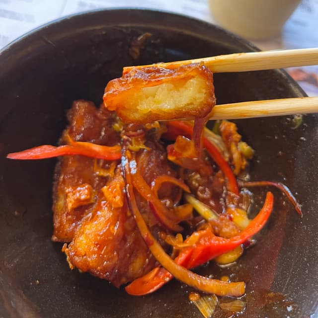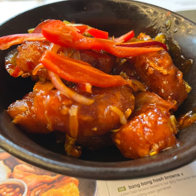 🥔🌶️This they managed to make correctly. It’s little half moon #hashbrowns in their #firecracker sauce with #redonion 🧅and #springonion and #redchilli. I love that sauce on their #bangbang cauliflower but maybe it was a bit too much at #breakfast time. I wouldn’t order this again but I am curious to try the corn 🌽fritters and a correctly made Bao bun. They are only serving #brunch at select Wagamama so check before hand that your branch is serving. They have a new app called soul club to get free stuff. It didn’t work on this occasion as you need to order a main over £12 to qualify for stamps and to get rewards. Bummer.