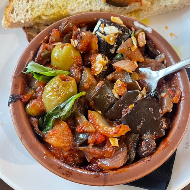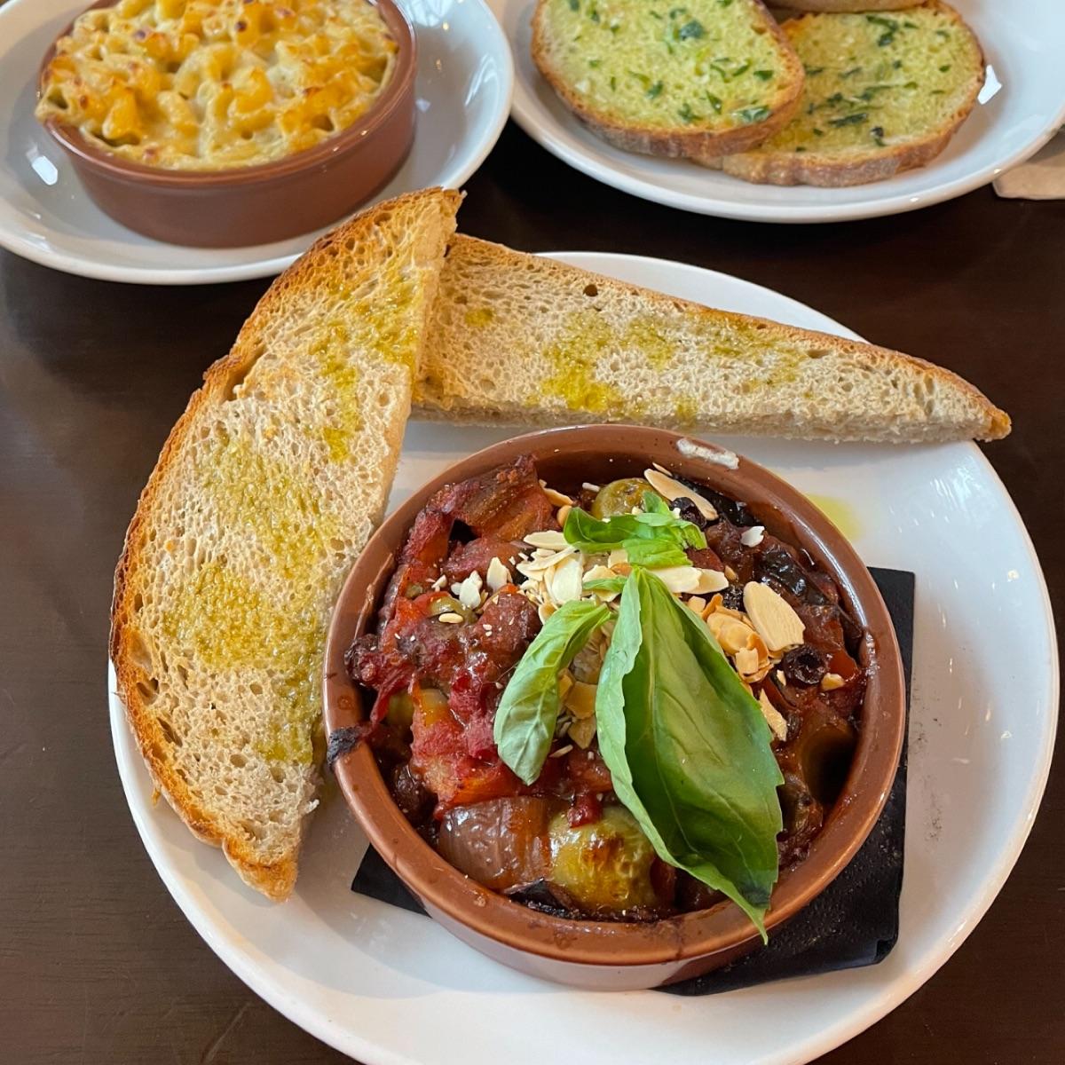 I was really excited to see this on the menu because I really fancied something vegetable-based! 🍆🫒 really liked the flavour combo of the aubergine, capers and olives. I wish maybe it was a bit more saucy/melty in texture but that’s just a preference #aubergine #veganrestaurant #allveganrestaurant #olives #bread