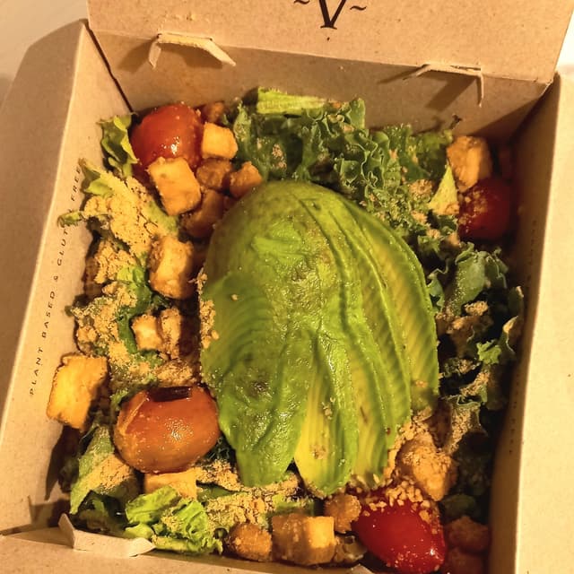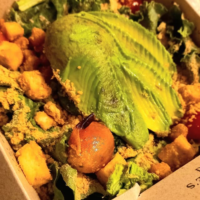 Me gusto pero el dressing no tanto, muy seco, tuve que agregarle aceite de oliva y vinagre porque era muy seco todo, en una ensalada asi el dressing es sumamente importante. Mucha lechuga, garbanzos crocantes,tofu, levadura nutricional, tomatea cherry que estaban aplastados, en fin. No es mi favorita. Y el delivery tardo una hora en llegar.