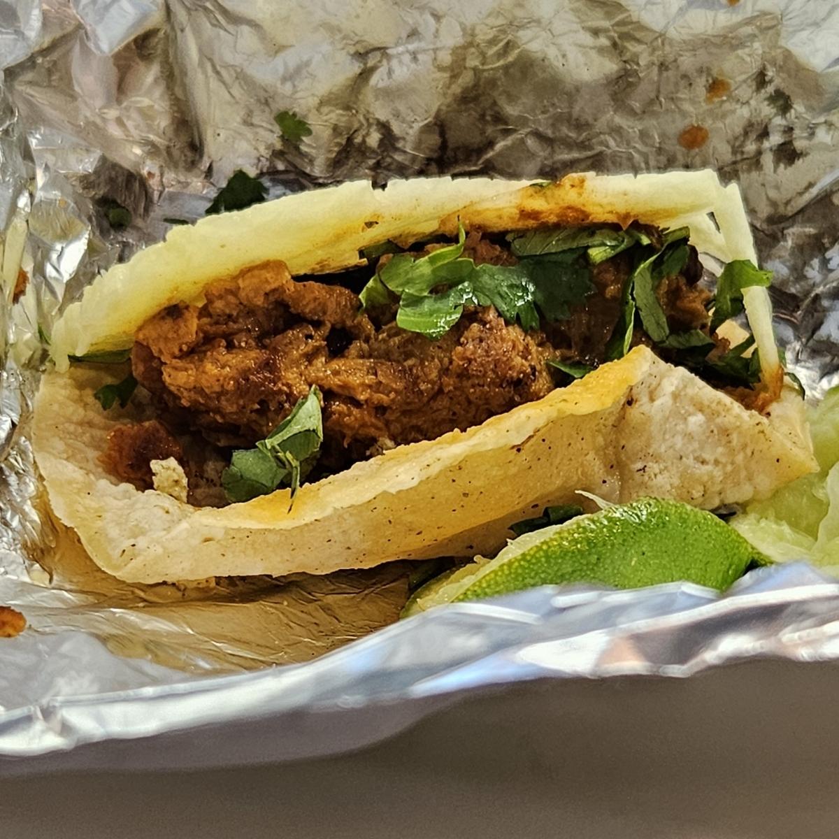My first time ordering this taco 🌮 and it was good with lime, pineapple and sauce. The handmade tortilla adds up 😋