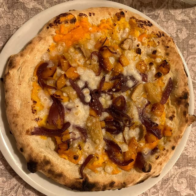 Pizza autunno con crema e dadini di zucca, cipolle caramellate e formaggio vegetale. Buonissima, di questa pizzeria mi piace soprattutto la pasta della pizza.