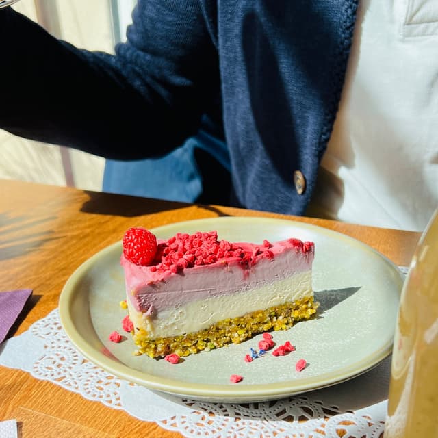 Torta crudista servita per colazione a base di cioccolato bianco e lamponi. Molto buona e gustosa, accompagnata in menu da un succo #santuariocapraliberatutti