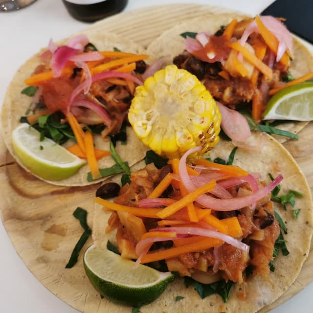 Tres tacos de jackfruit a la barbacoa, espinacas frescas, cilantro, cebolla y calabaza encurtidas y lima, acompañados de mazorca de maíz y decorados con salsa bbq casera. Me parecen muy originales y una opción bastante sana y ligera, además de que están muy ricos. #vegantacos