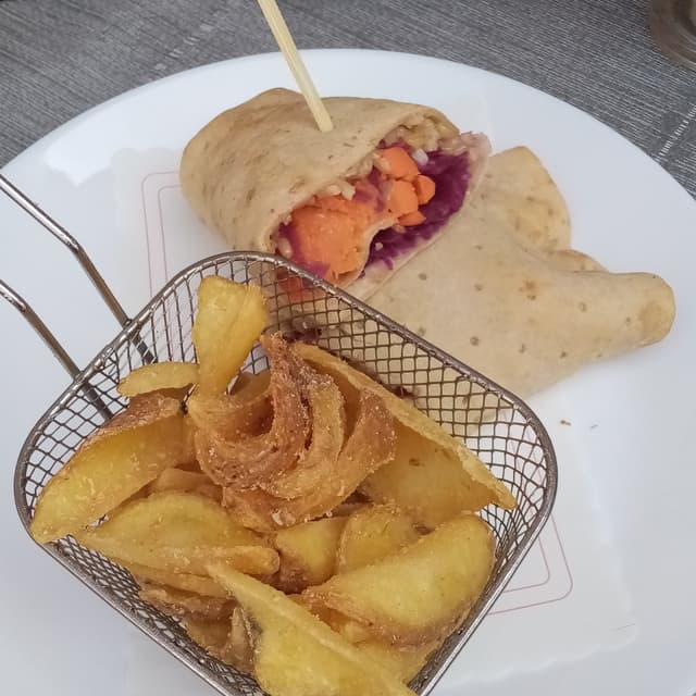 gli mancava un po' di sapore 🙄 anche solo una maio veg o della senape o meglio ancora del paté di olive 😋 ... e invece era proprio scondito, sia il riso integrale, sia il cavolo rosso e pure i bastoncini di carota e zucca... tutto senza sale né olio.... insomma meno male che c'erano le patatine fritte belle unte e croccanti a riequilibrare tutto sto cibo dietetico e salutare 😅😉 13€ #veganin2023 #veganisnotscary #plantbased #vegan ##potatolover #wrap #rice #vegetables