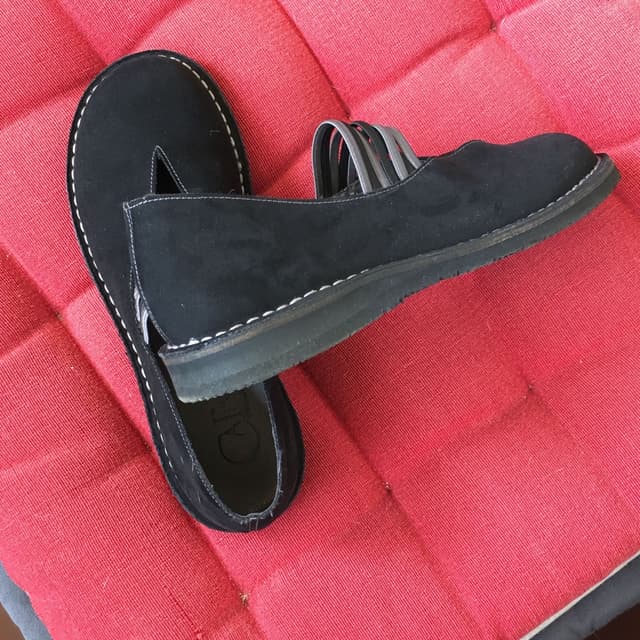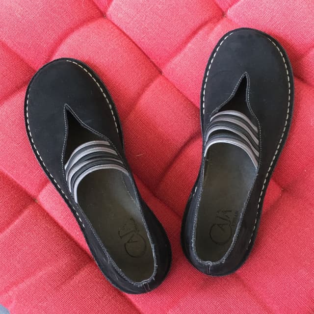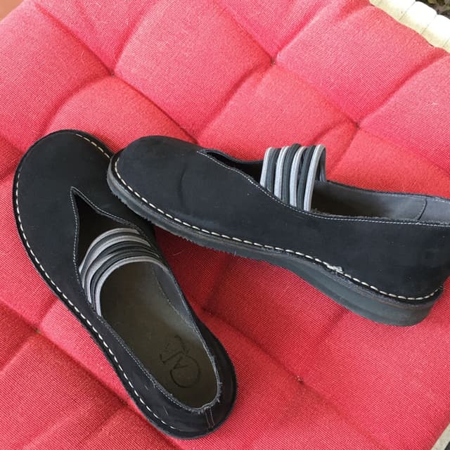 Queste ballerine hanno un’ottima consistenza e hanno i lacci piuttosto originali. La suola è antiscivolo. Sono un po’ rigide e purtroppo feriscono il tallone perché la cucitura posteriore non è perfettamente appiattita nonostante l’ottima idea dell’inserimento in quel punto di una sorta di cuscinetto. Nulla che non si possa sistemare con qualche martellatina ben assestata da parte di un calzolaio. Il colore è interessante è veramente non sembrano affatto vegane.
