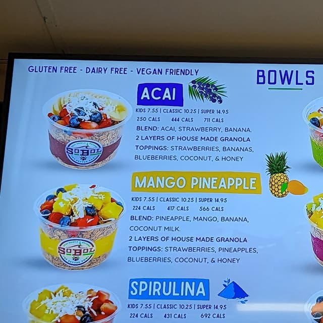 Founded in 2013, SoBol is a cafe that specializes in acai bowls, green bowls, fruit smoothies & beyond. We believe that eating healthier alternatives should never be a chore. That’s why we pride ourselves in blending our acai fresh each day, producing our own homemade granola and topping our product with only the freshest of fruits. All of our product is real food for people looking for a delicious, quick and affordable meal. At SoBol, we strive to give you the best product, with the best customer service at the most competitive price. SoBol is not just a cafe in a local town, it is a community gathering spot. SoBol is a place where everyone can get a delicious meal where they feel better after visiting. Our team, our processes and our product all drive to make SoBol a place to get #thebetterbowl
